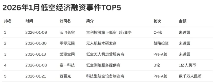 2026年1月低空经济融资报告:总额20.26亿元,苏粤领跑