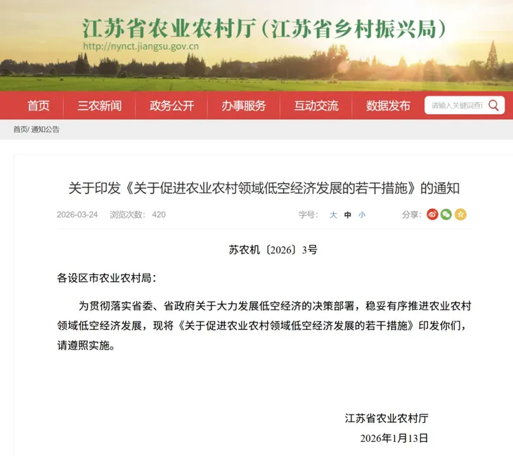 关于促进农业农村领域低空经济发展的若干措施(图源:江苏省农业农村厅)